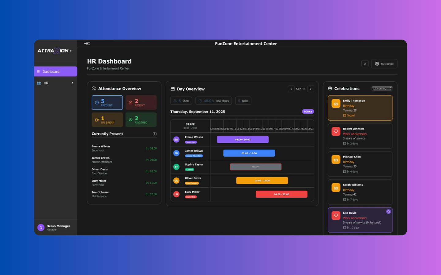 Specialized workforce management designed to meet the dynamic needs of businesses in the leisure sector— from theme parks to activity centres, and resorts. Attraxion streamlines HR operations and rota scheduling, helping employers maintain smooth staffing and compliance in a fast-paced, customer-focused environment.